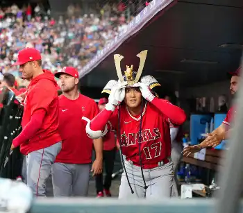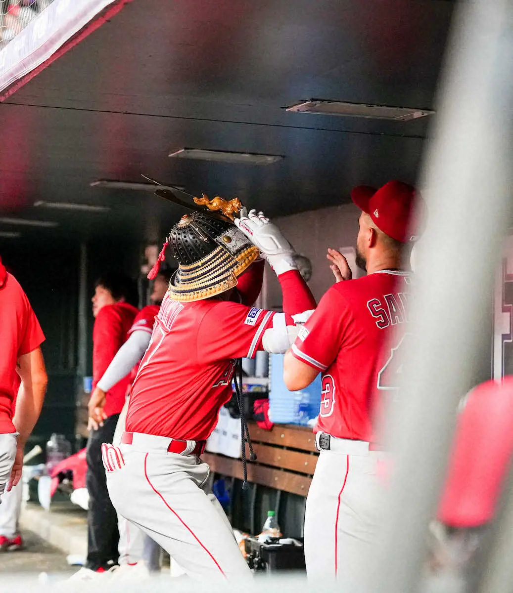 <ロッキーズ・エンゼルス>5回、日米通算200号本塁打を放った大谷はナインの出迎えを受けた大谷は兜(かぶと)が天井に当たらないように気をつける(撮影・沢田 明徳)