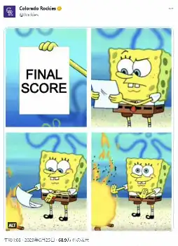 球団の公式ツイッターは、「FINAL SCORE」と書かれた紙を燃やしているアニメのキャラクター「スポンジボブ」のイラストを投稿。切り替えを強調したが、地元紙「デンバー・ポスト」電子版は「史上最悪の負け」と報じたほか、ネットの上のファンは怒り心頭で大荒れの様相となった。