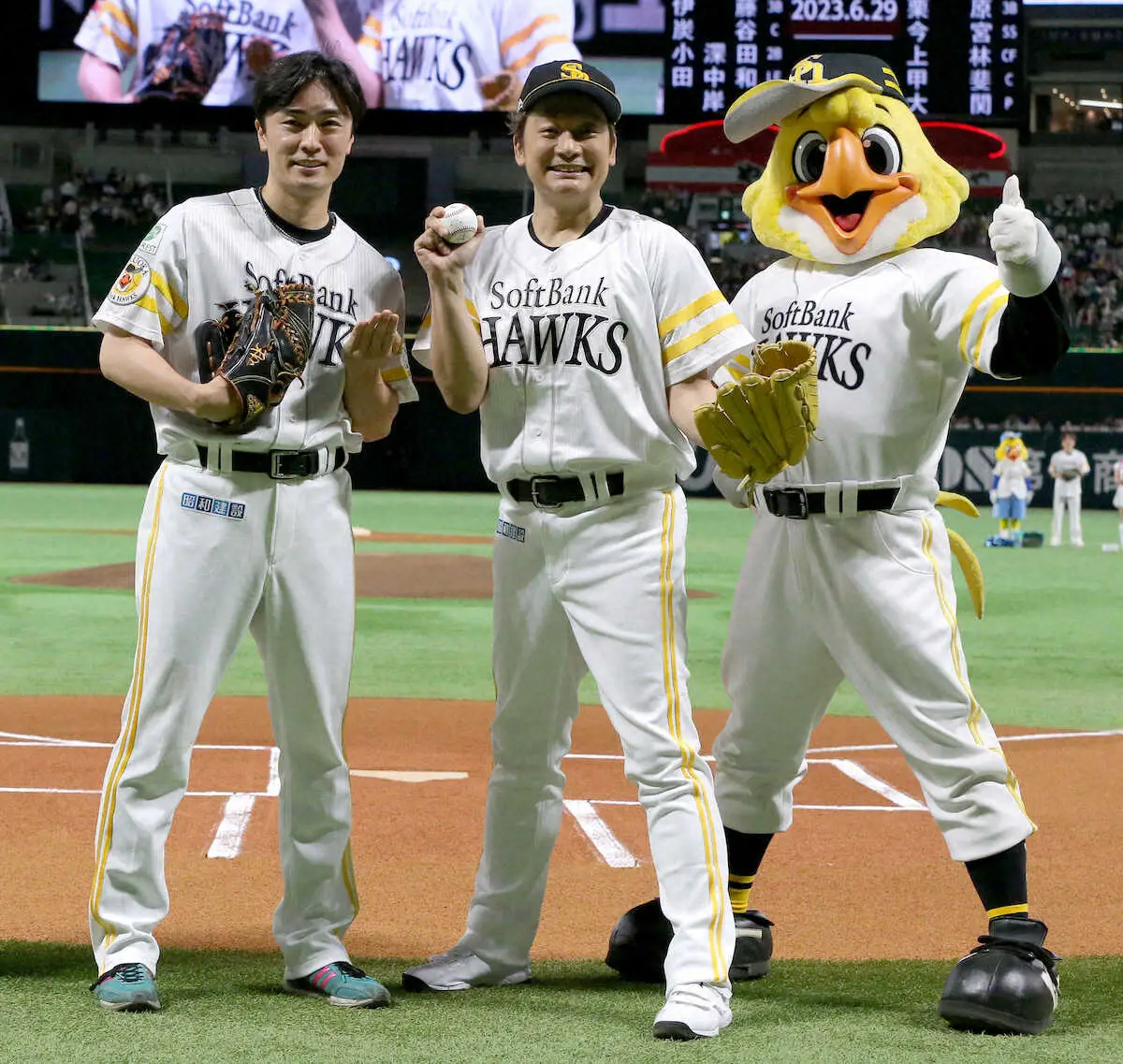 背番号「405」が刻まれたソフトバンクのホームユニホームを身にまとって登場した香取は、マウンドに上がって帽子を取って一礼。捕手を務めた和田のサインに一度首を振るパフォーマンスを見せた後、構えたミット目掛けて笑顔で投球。見事にノーバウンド投球を披露し、サムアップポーズ。笑顔でファンの大歓声に応えた。
