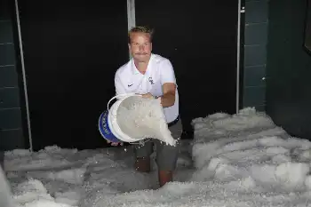 デンバーは大荒れの天気 ロッキーズの本拠地に大量の雹(ひょう)が降り積もる