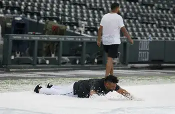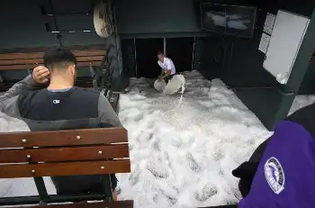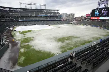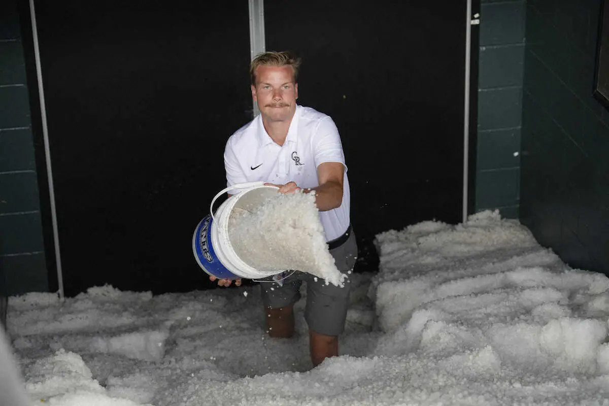この日はドジャース戦を控えていたが、試合開始前に球場のあるコロラド州デンバーは大雨と強風を含む悪天候に見舞われ、グラウンドには大量に降った豆粒大の雹(ひょう)がびっしり。ベンチやクラブハウスにも雨や雹が流れ込み、スタッフは雹と雨水をかき出す清掃作業に追われていた。