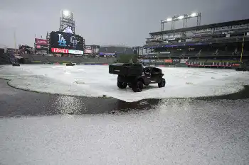 デンバーは大荒れの天気 ロッキーズの本拠地に大量の雹(ひょう)が降り積もる