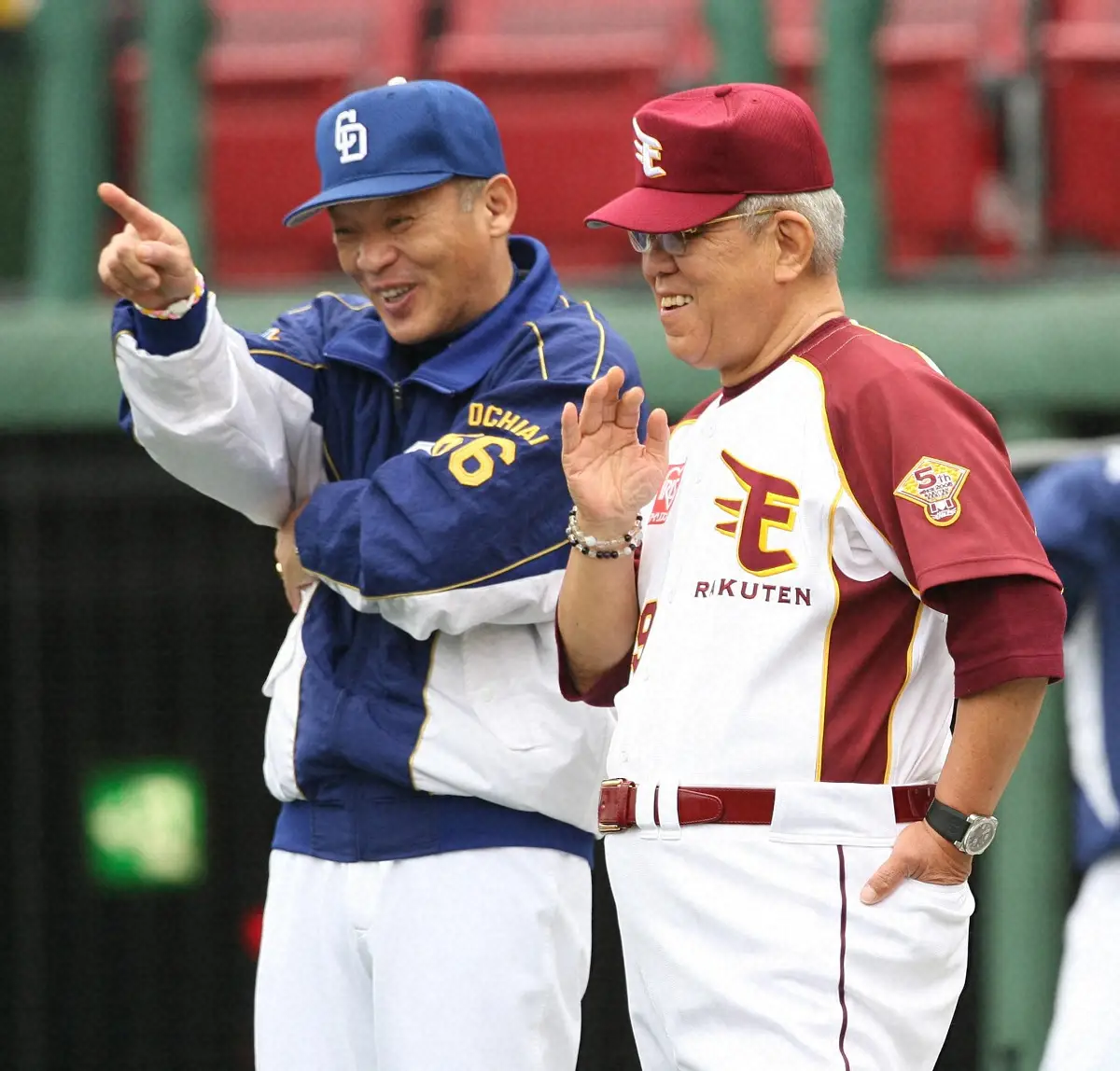 2009年、交流戦の試合前に楽しそうに話し込む楽天・野村克也監督(右)と中日・落合博満監督