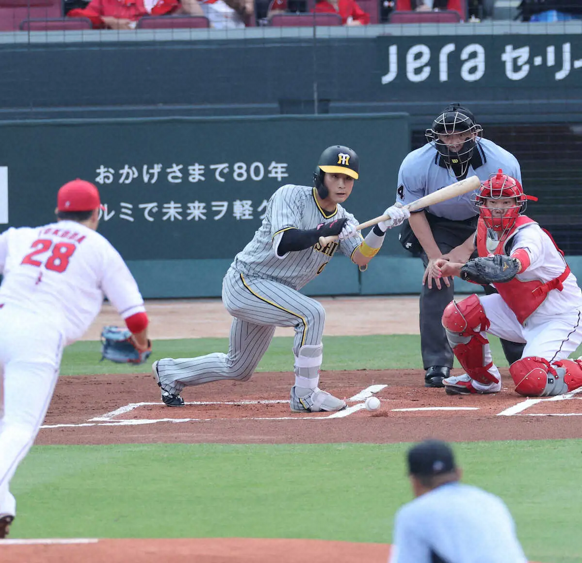 <広・神>初回、犠打を決める木浪(撮影・岸 良祐)