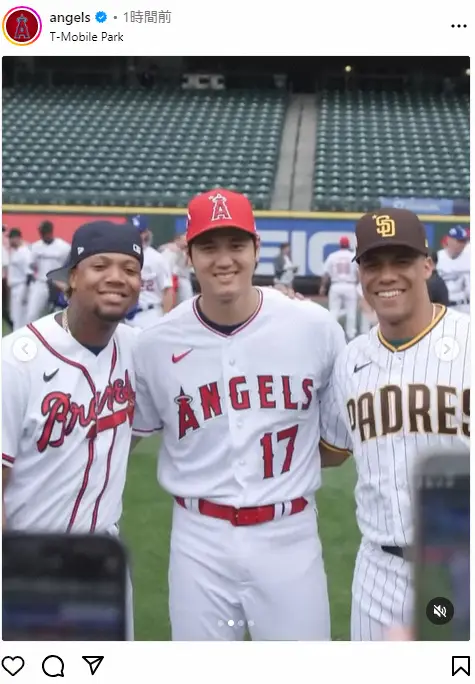 球宴ファン投票トップのアクーニャ(ブレーブス)、ソト(パドレス)がスマホを片手に大谷のもとに歩み寄り、「調子はどうだい?」と言葉を交わしてハグした。