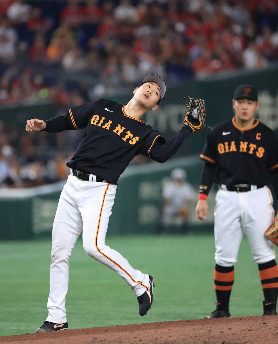 <巨・広>4回、上本の飛球を自ら捕球する山崎伊 (撮影・西川祐介)