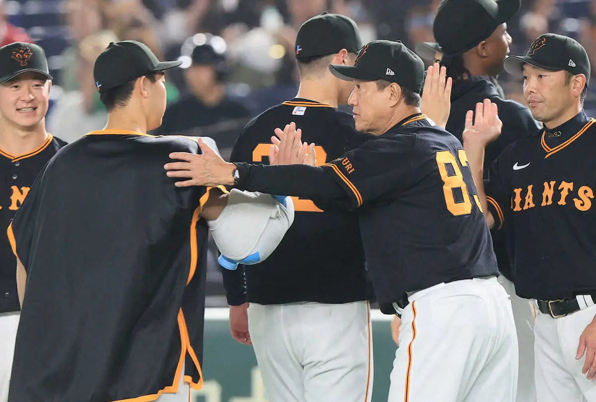<巨・広>勝利投手の山崎伊(左)をねぎらう原監督(撮影・尾崎 有希)