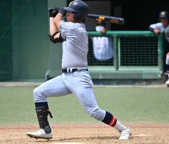仙台育英打線の中で異色の雰囲気を醸し出す斎藤敏。左肩にバットを担ぐように構え、すり足からボールをすくい上げるように豪快に振り抜く。アッパー気味でも高めの直球をさばくのもうまく、須江監督も「うちで一番のバッター」と信頼は厚い。この日の先制ソロは打った瞬間それと分かる完璧な打球で、その後の2安打も真芯で捉えた鋭い打球。自身も「ホームランのあとも大振りにならないで振れた」と手応えを得た様子だ。