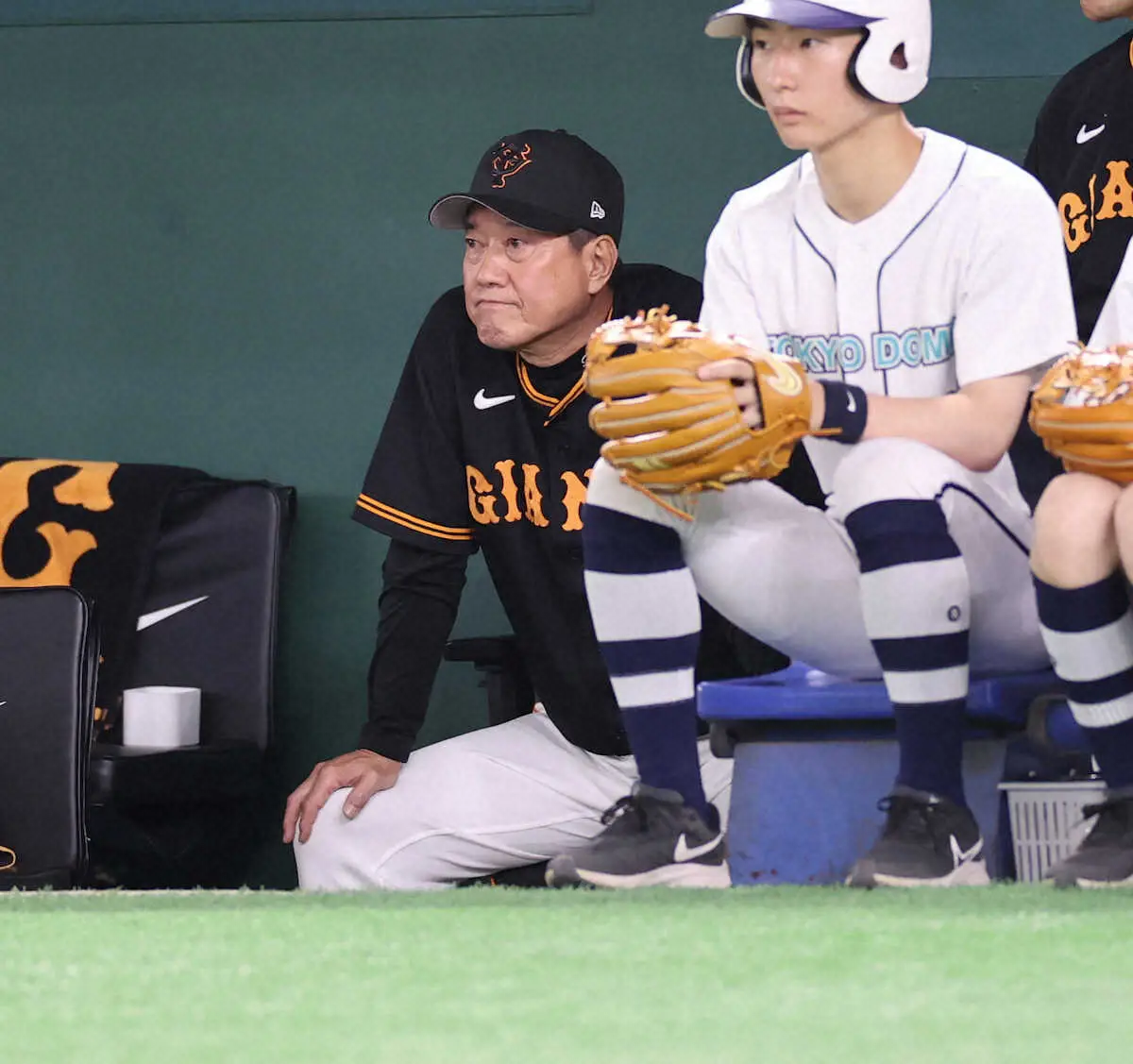<巨・広>延長11回、坂倉に2点適時打を打たれベンチで座り込む原監督(撮影・篠原 岳夫)