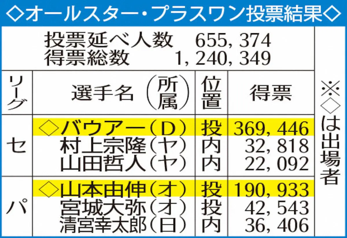 プラスワン投票最多得票選手 Photo by スポニチ “最後の一人”DeNA・バウアーが球宴主役 プラスワン史上最多得票で選出で… ギャラリーで見る この記事のフォト 2023年07月15日の画像一覧 もっと見る 2023年07月15日の画像をもっと見る