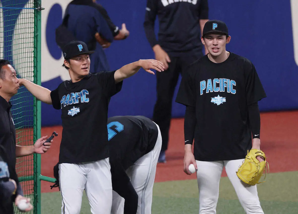 オールスター第1戦<全セ・全パ>談笑する山本(左)と佐々木朗(撮影・大森 寛明)
