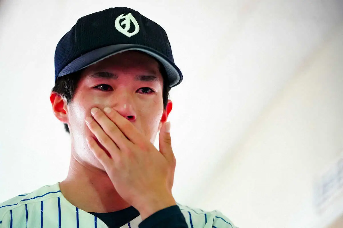 兄と比較されることも多かった3年間を「野球をやりやすい環境ではなかったがみんなが支えてくれた」と振り返った右腕。涙を拭いながら「大学でもやりたい。投手として」と成長を誓った。(村井 樹)