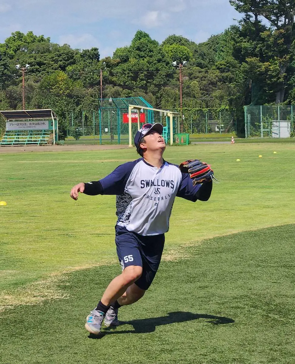 視線の先にはタイトルが…?練習でノックの飛球を追う村上