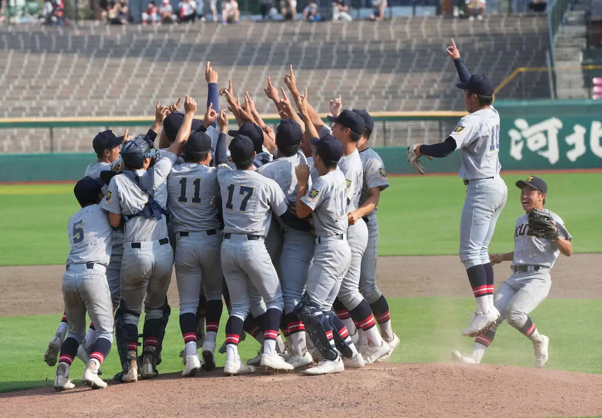 投打共に圧倒した仙台育英が快勝で2年連続30度目の甲子園出場を決めた。勝利が決まるとマウンド上で人差し指を突き上げながら喜び合い、夏の甲子園連覇へ向けまずはスタートラインに立った。