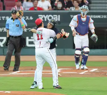 また、先発を務めた広島・九里が1番のオリックス・杉本に対しての初球で大暴投。杉本がマウンドに歩き出し、一触即発の雰囲気となったが、九里と抱き合う“乱闘ドッキリ”を演じた。