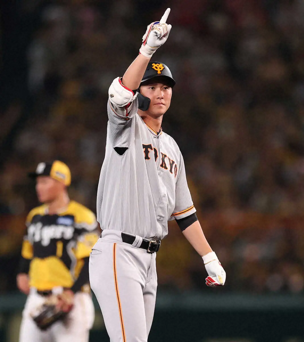 <神・巨>5回1死一塁、勝ち越しの適時二塁打を放ち、ベンチに向かってポーズを決める秋広(撮影・北條 貴史)