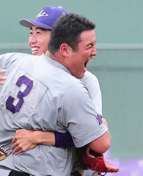 <花巻東・盛岡三>優勝し仲間と抱き合う花巻東・佐々木麟(右)(撮影・光山 貴大)