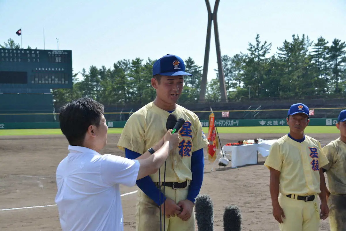 <高校野球石川大会 決勝>8回に決勝打を放った星稜・萩原はヒーローインタビューを受ける