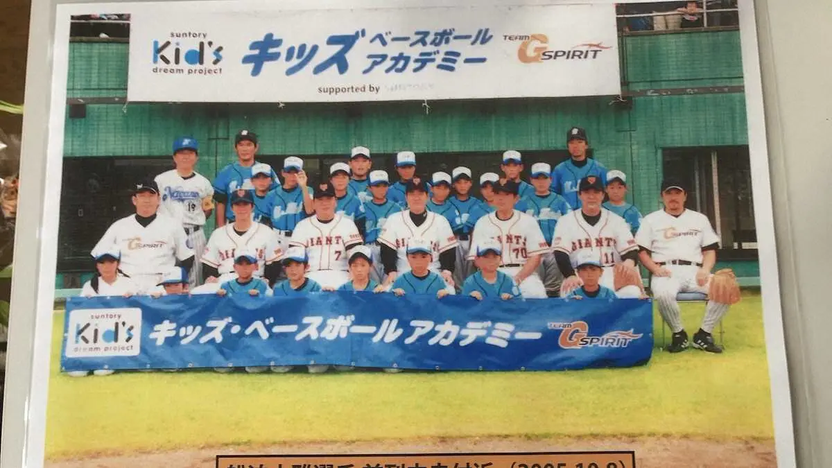 小学生時代に参加した野球教室で原監督と集合写真に収まる巨人・船迫(原監督の左下=家族提供)