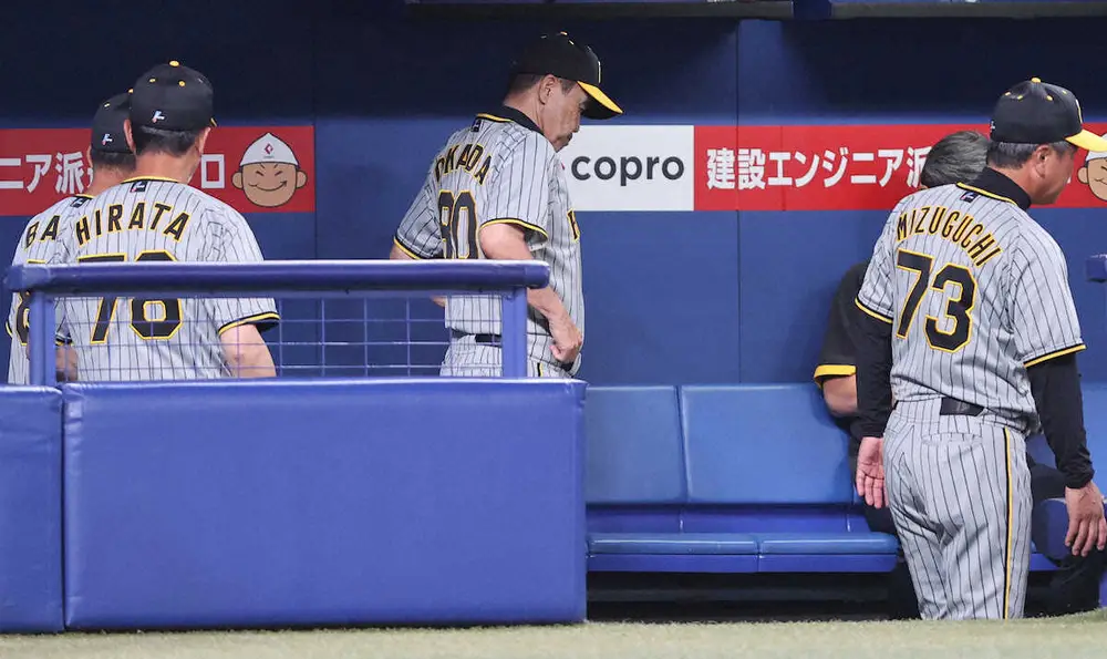 <中・神(17)>中日に敗れ、渋い表情で引き上げる岡田監督(中)(撮影・椎名 航)