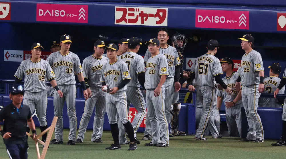 <中・神(17)>ベンチ前で選手を迎える阪神ナイン