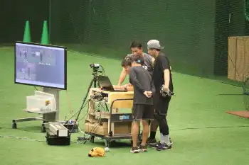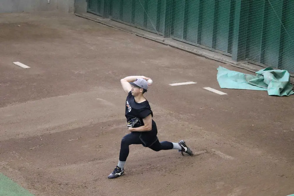 室内練習場で約50メートルのキャッチボール後、ブルペンの傾斜を使ってフォームを確認。