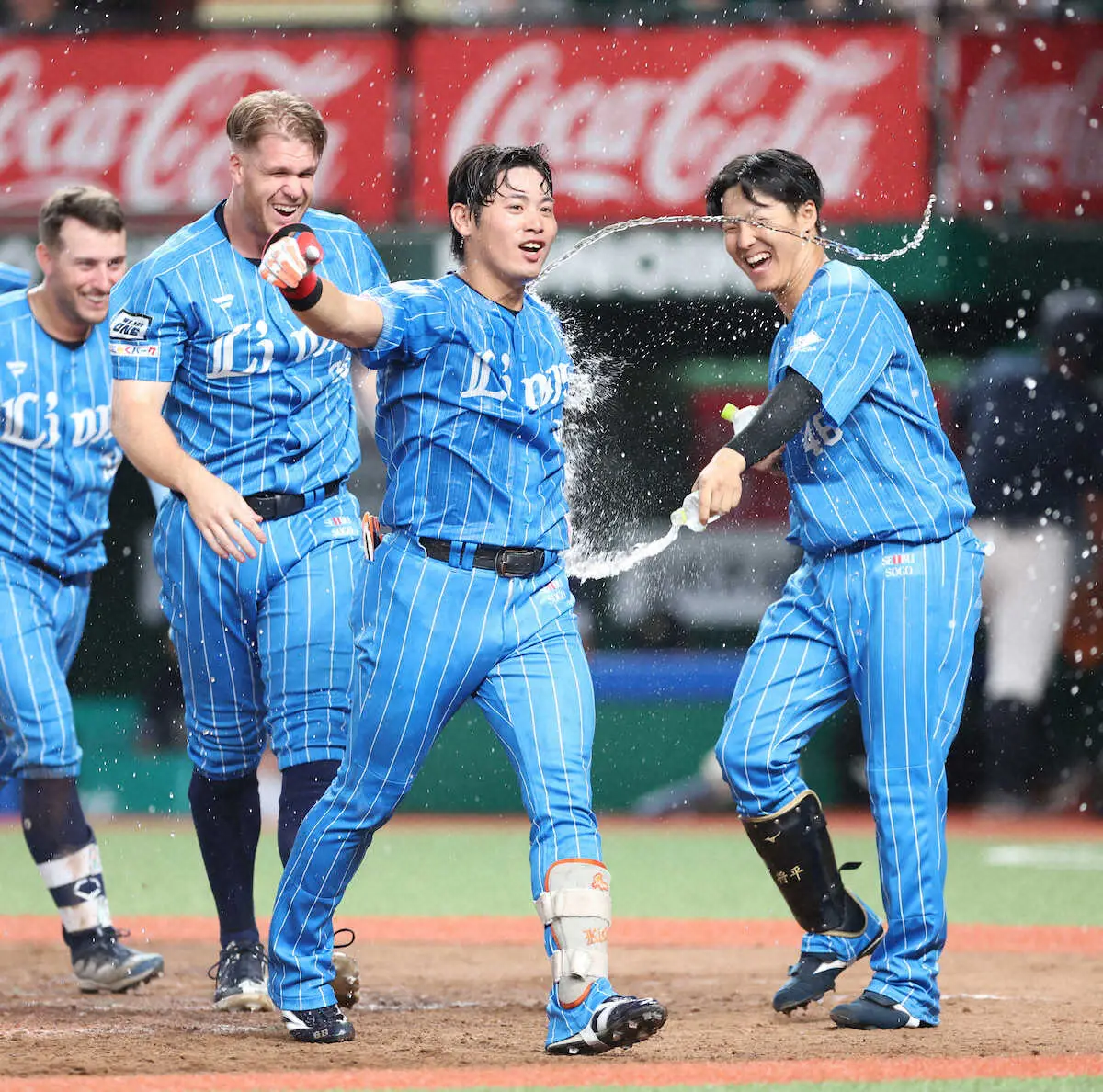 足がつった長谷川に代わって8回守備から途中出場。迎えた初打席で大仕事だ。歓喜のウオーターシャワーに「気持ち良かったけど、炭酸水が混じっていて目が痛いです」と手荒い祝福も初体験だ。