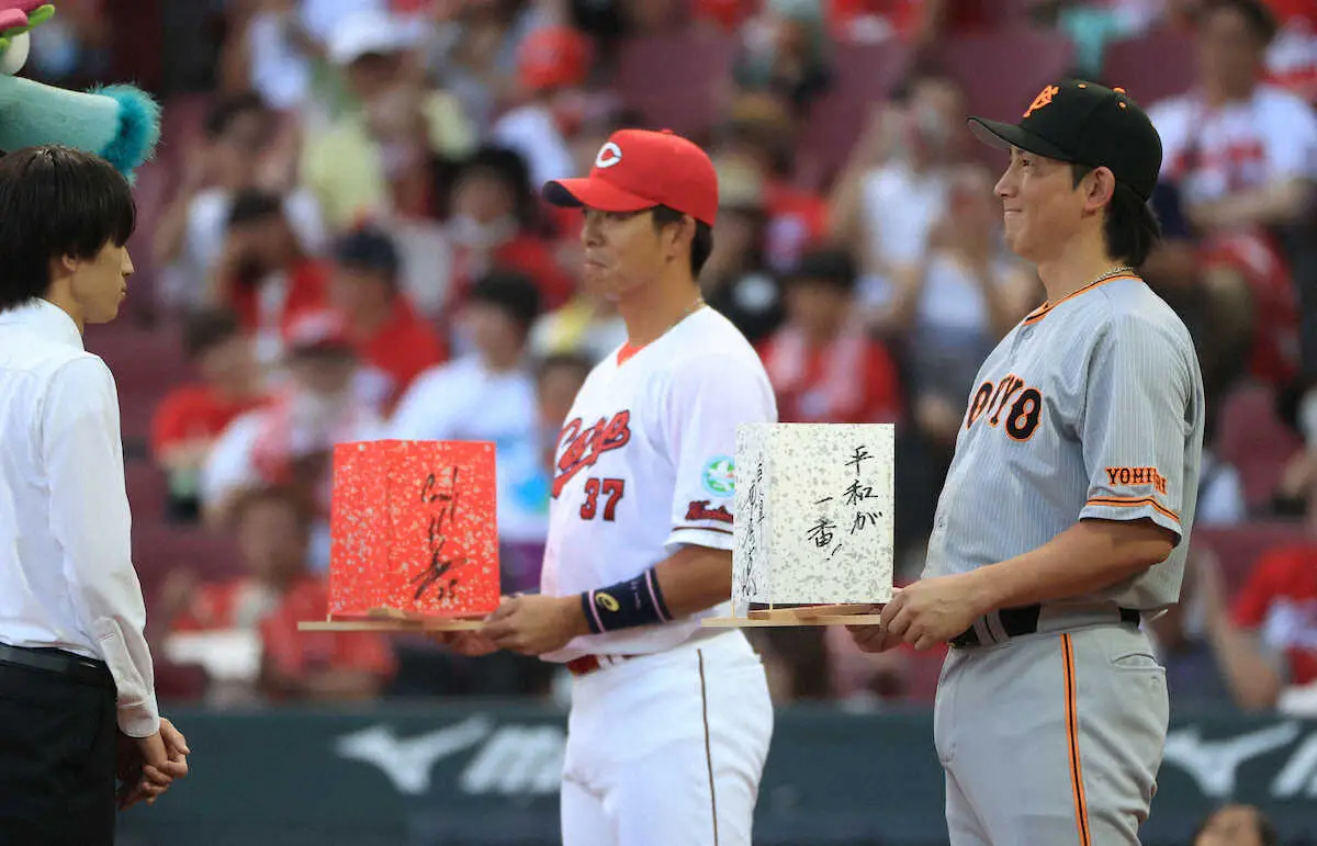 <広・巨>8月6日、平和を願い巨人、広島両軍監督からの灯籠が手渡された(撮影・西川 祐介)