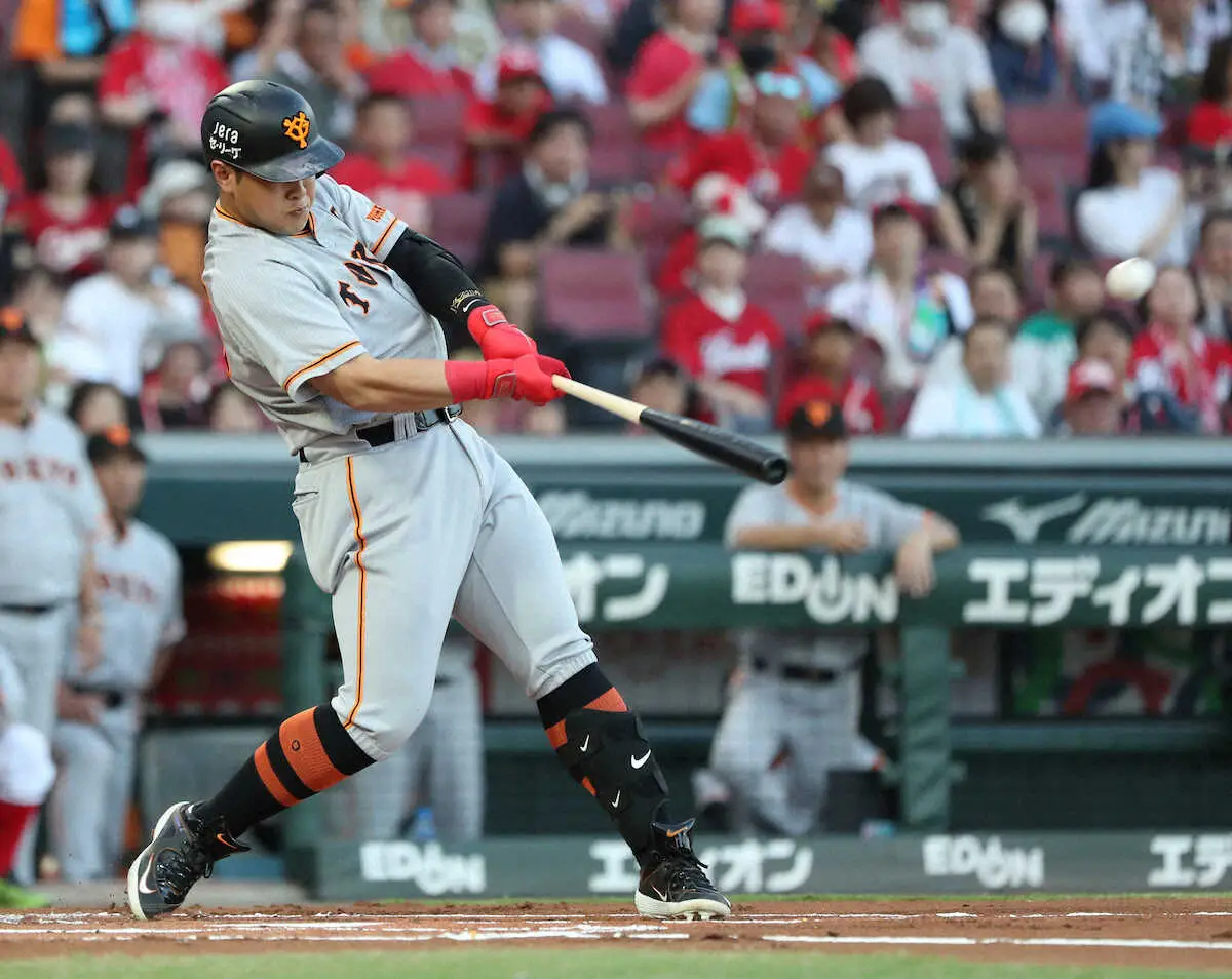 <広・巨>1回2死一塁、岡本は左越えに2点本塁打を放つ (撮影・奥 調)