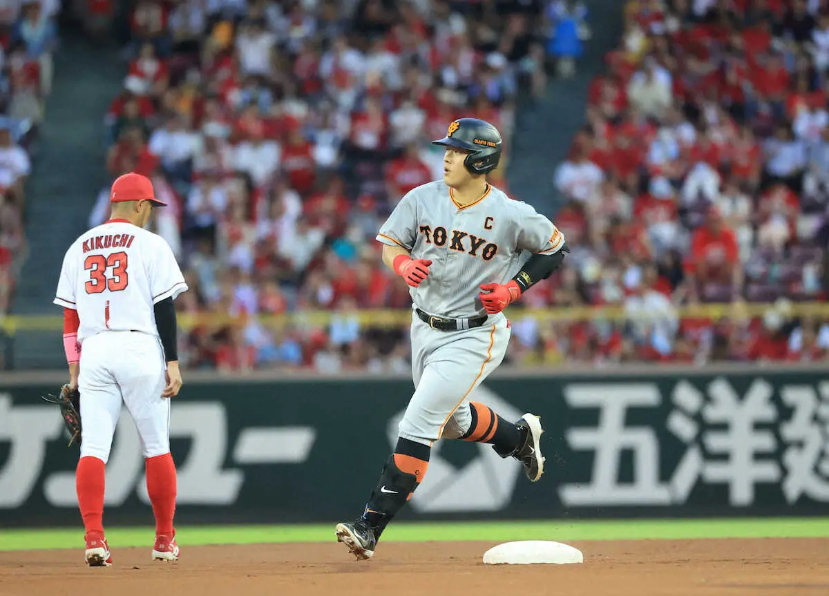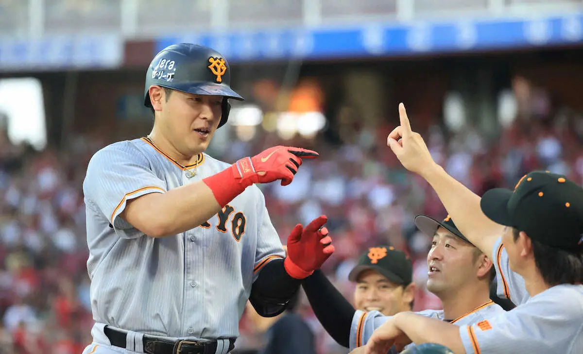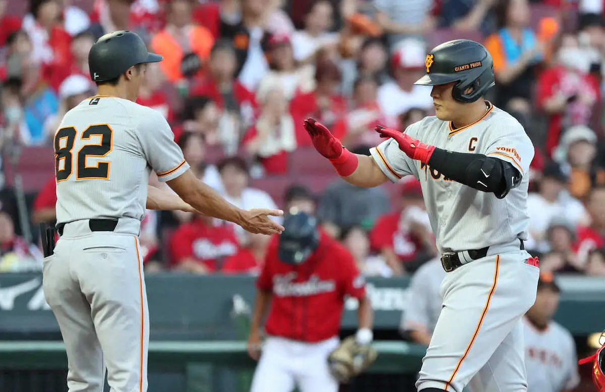 <広・巨>1回2死一塁、岡本は左越えに2点本塁打を放ち生還 (撮影・奥 調)