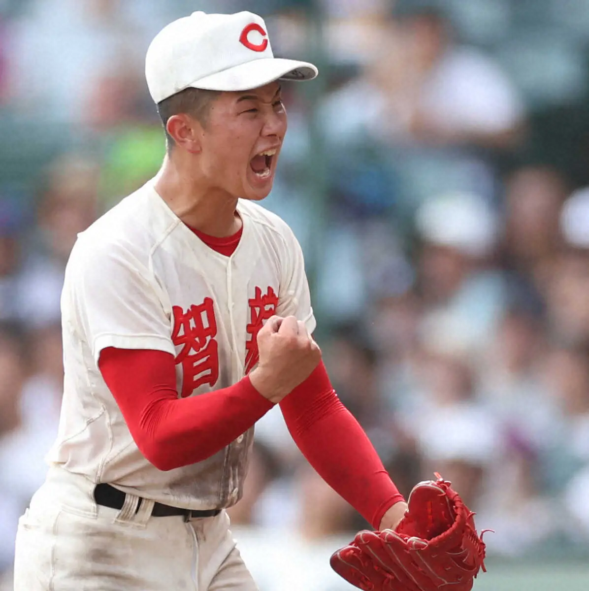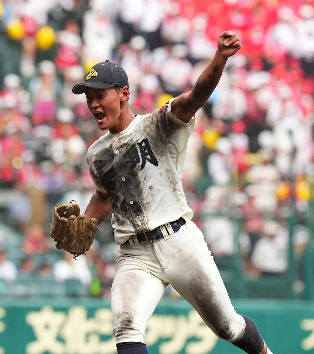 <智弁学園・英明>7回1死満塁、英明・平見を投ゴロ併殺に仕留め、ガッツポーズで雄たけびを上げる智弁学園・中山(撮影・北條 貴史)