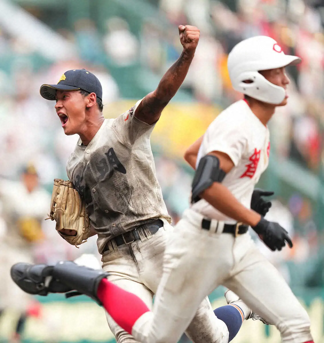 <智弁学園・英明>8回、英明・寿賀は川原崎(右)を投ゴロに抑えガッツポーズ(撮影・岸 良祐)