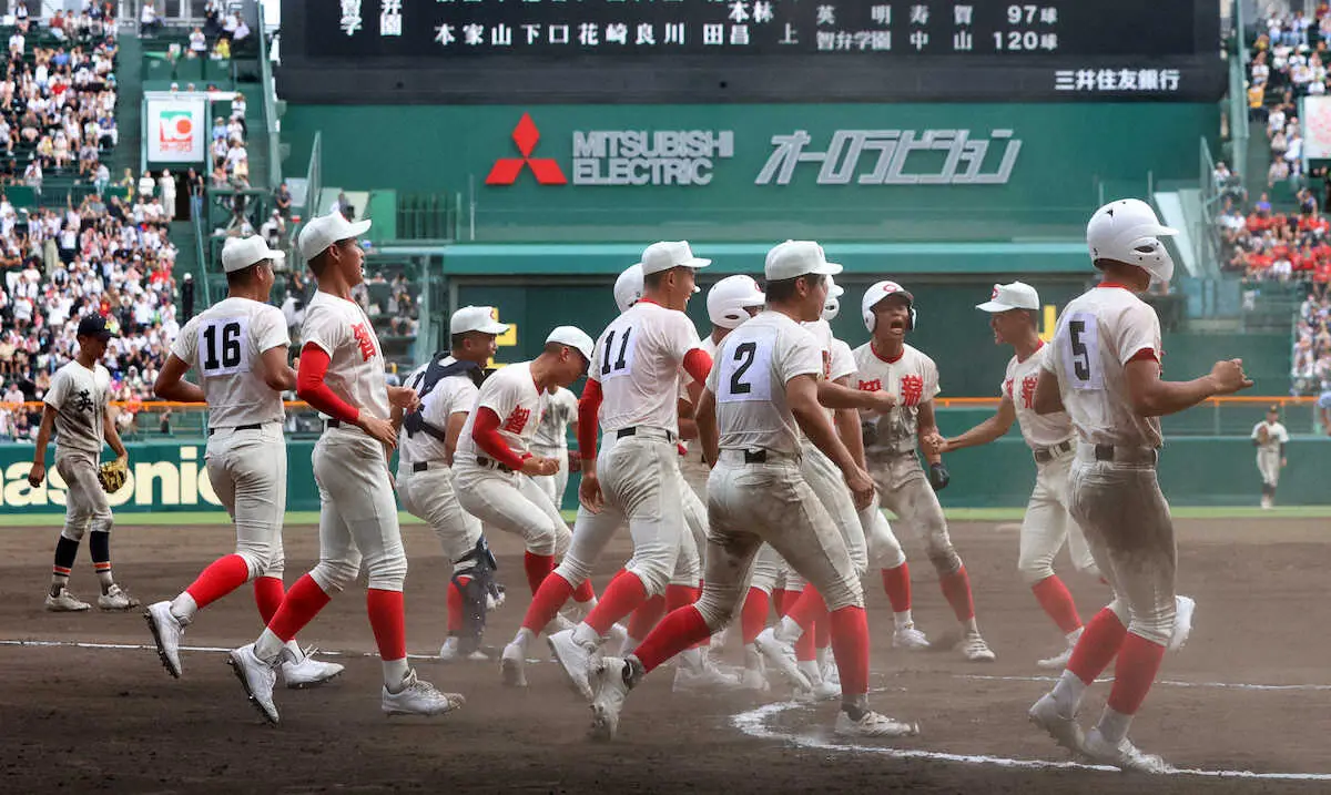 <智弁学園・英明>10回1死二、三塁、サヨナラ勝ちで初戦を突破し、歓喜の智弁学園ナイン(撮影・北條 貴史)