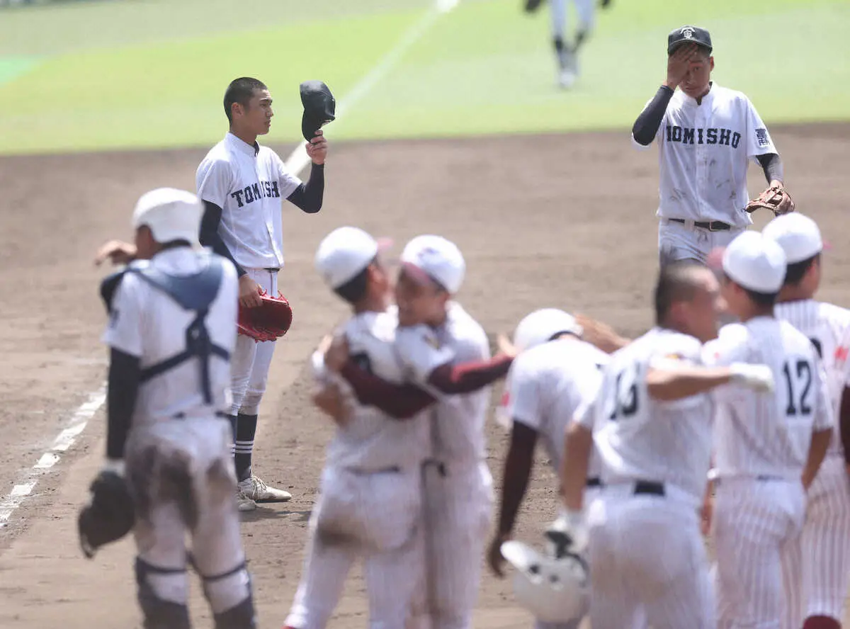 <鳥栖工・富山商>延長11回、鳥栖工にサヨナラ負けを喫した富山商・上田(左)(撮影・平嶋 理子)