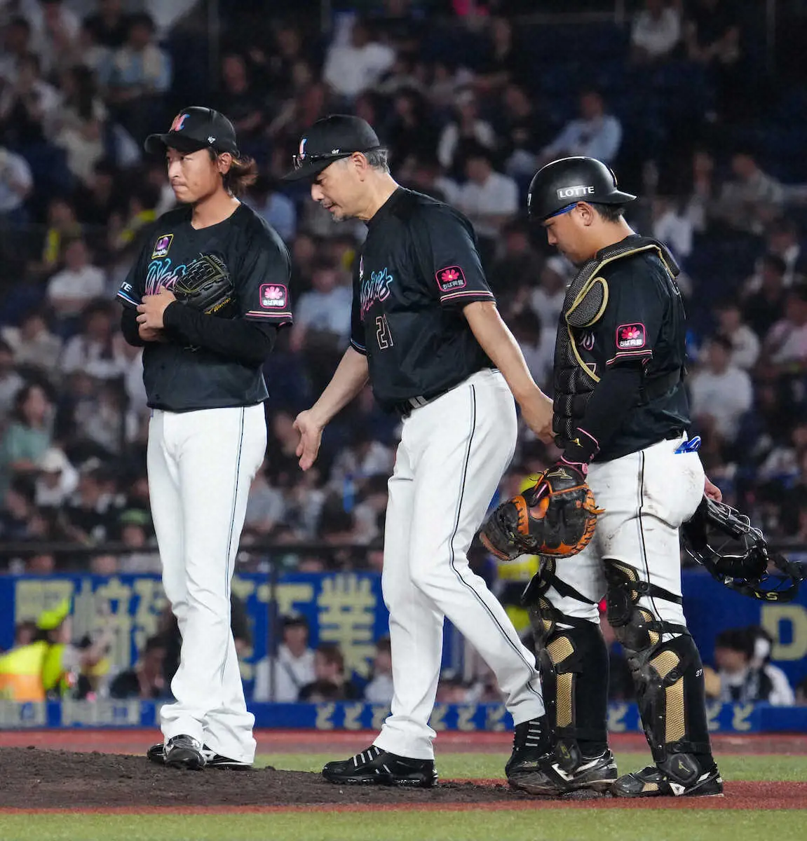 <ロ・オ>7回、自らマウンドに向かい2ラン2本を浴びた坂本に降板を告げる吉井監督(撮影・長久保 豊)