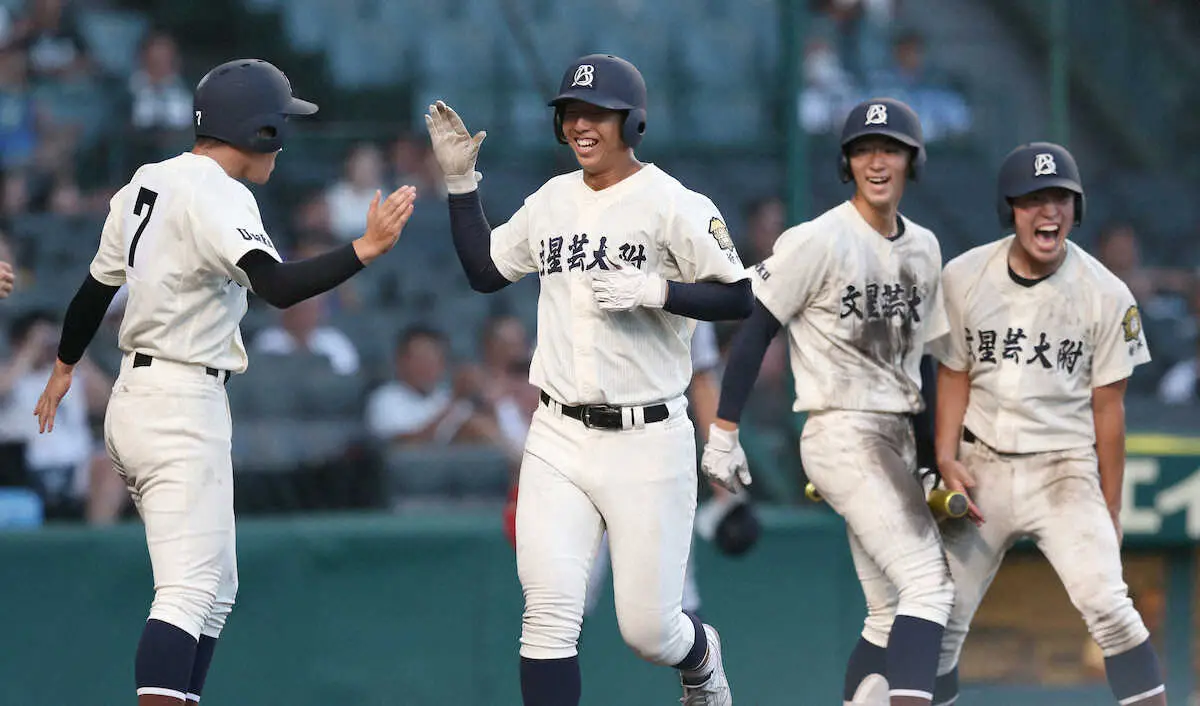 <宮崎学園・文星芸大付> 8回無死一、二塁、右前打を相手の後逸で本塁に生還し喜ぶ文星芸大付・工藤(左から2人目) (撮影・亀井 直樹)