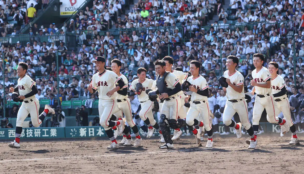 <九州国際大付・土浦日大>スタンドに駆け出す土浦日大ナイン(撮影・藤山 由理)