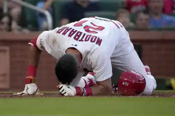 <カージナルス・アスレチックス>5回2死一塁、自打球を股間に当てて悶絶するヌートバー(AP) Photo by AP ヌートバーが悶絶、途中交代 自打球がワンバウンドで股間に“ドン” 球団… ギャラリーで見る この記事のフォト 2023年08月17日の画像一覧 もっと見る 2023年08月17日の画像をもっと見る