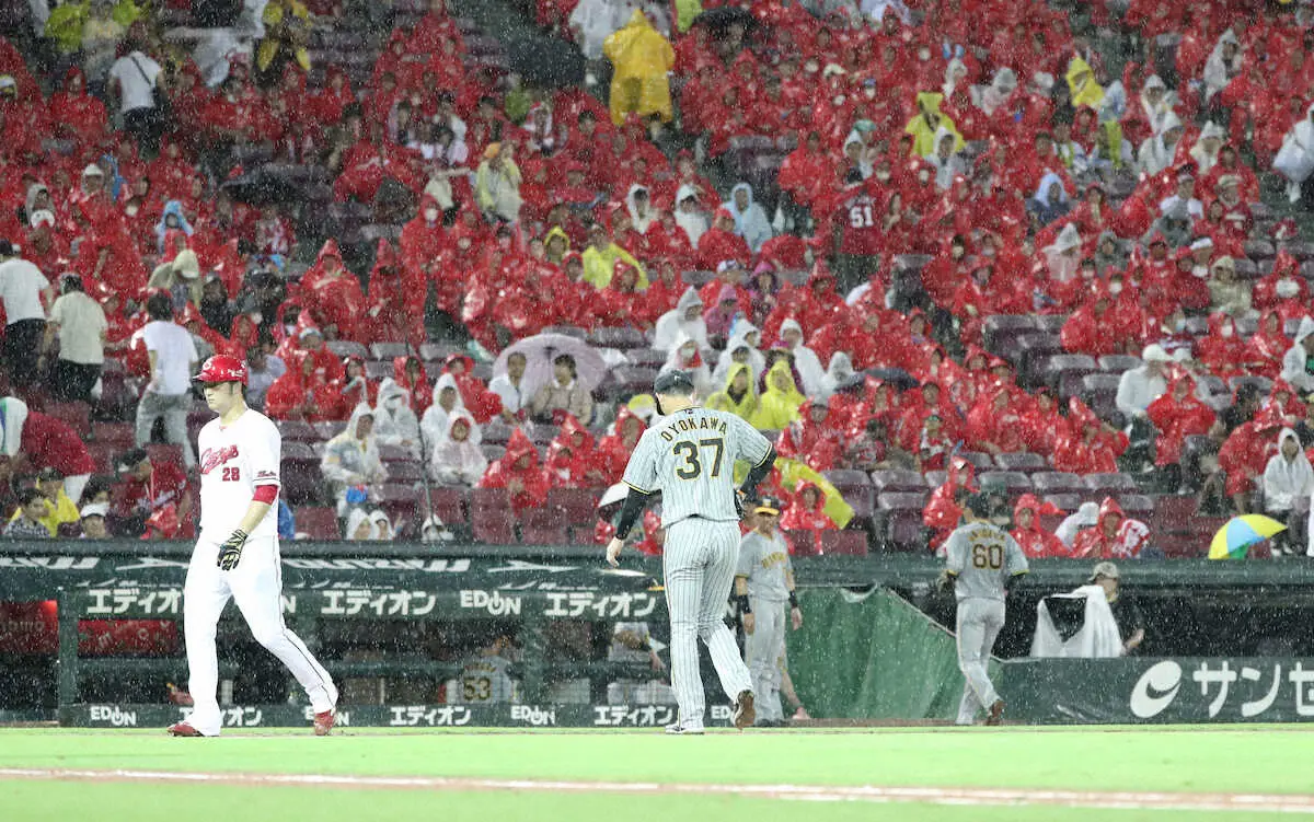 34分間の中断後、“続投”して再びマウンドへ。仕切り直しの2球で西川を左飛に抑えた。回をまたいだ5回も1死から堂林に左前打されながら、一発のあるデビッドソンを二ゴロ併殺。本人は反省の弁ながら、突然やってきた出番で、雨に水を差されても最低限の仕事は果たした。