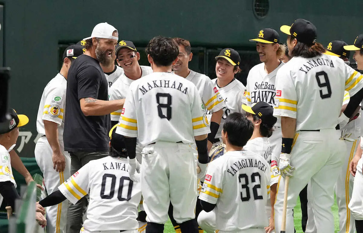 これには選手も笑みを見せながら、気合いが入った様子。その後、サファテ氏は今宮や柳田らと握手をかわし、旧交を温めた。