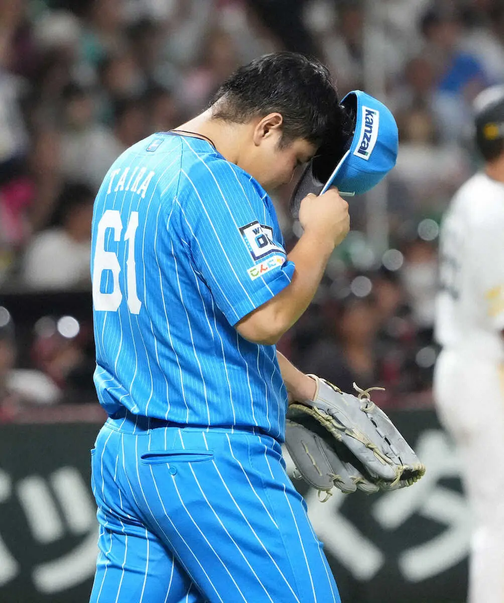 <ソ・西>2回、ソフトバンク打線につかまり厳しい表情の平良(撮影・岡田 丈靖)