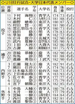 U18壮行試合・大学日本代表メンバー Photo by スポニチ 大学日本代表に東洋大・細野、青学大・常広ら 28日VS高校日本代表 ギャラリーで見る この記事のフォト 2023年08月23日の画像一覧 もっと見る 2023年08月23日の画像をもっと見る