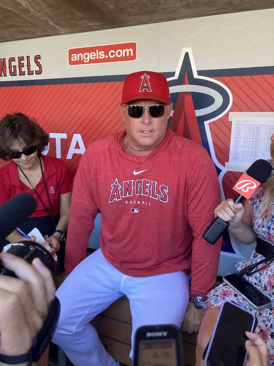 日米メディアの前で大谷翔平選手の翌日のスケジュールについて言及したエンゼルスのネビン監督(撮影・杉浦 大介通信員)