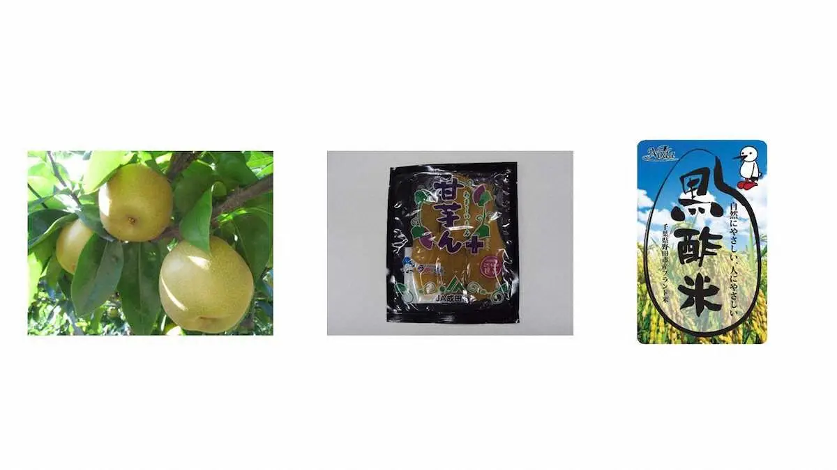 9月8~10日のロッテ―オリックス戦でプレゼントされる梨(市川市)、甘芋んぷらす(成田市)、黒酢米(野田市)の画像データ(球団提供)