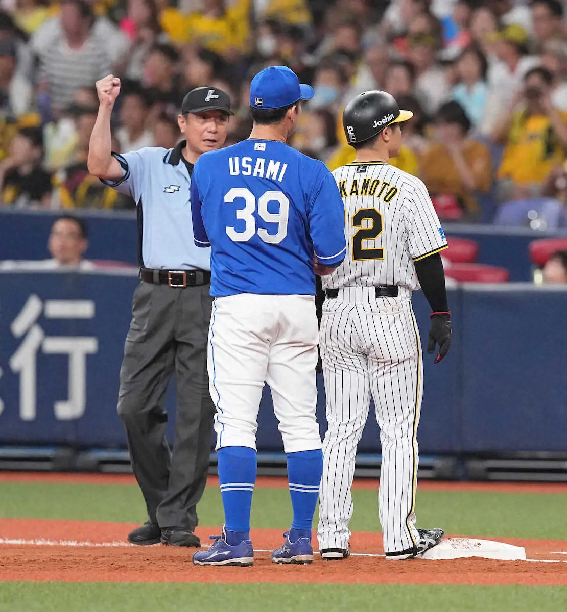 一目散に一塁へ帰塁した坂本もあ然とし、ベンチの岡田監督も「ん?」という表情。捕球した“自信のあった”岡林はもちろん一塁へ送球し、若干、首をかしげた。