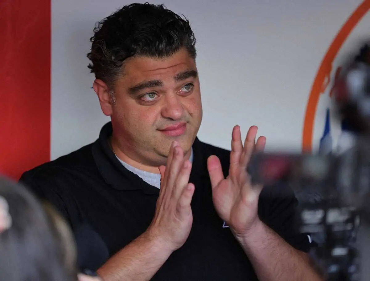 <メッツ・エンゼルス>試合前、報道陣に対応するミナシアンGM(撮影・光山 貴大)