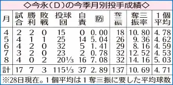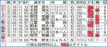 月別の奪三振率は4月10・80→5月9・36→6月8・16→7月12・52→8月14・16と7、8月に急上昇。両月とも32奪三振だったが7月は1三振を奪うのに要した球数は平均4・53球。それが8月は5・03球に増え、粘られるケースが目立っている。実際、今月は4試合に先発登板し0勝2敗、防御率7・08と調子が上がらない。歴代奪三振率10傑の投手は同年に全て2桁勝利を記録。奪三振王は6人(8度)いて、最多勝も4人(5度)が手にしている。現在7勝で足踏みの今永。昨年は11勝を挙げており、2年連続2桁なら自身初めて。29日の阪神戦に先発予定だが、本来の投球を取り戻せるか。(記録課・宮入 徹)