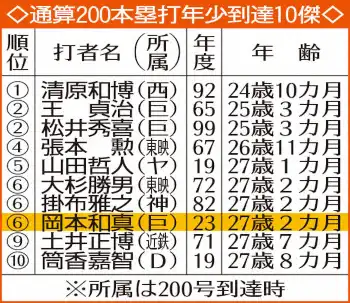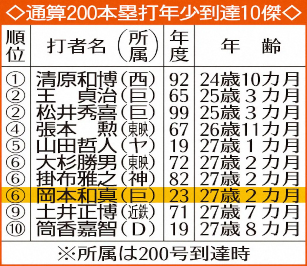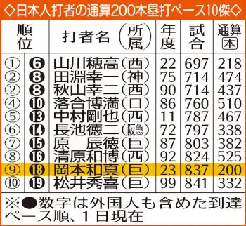日本人打者の通算200本塁打ペース10傑 Photo by スポニチ 巨人・岡本和が通算200号!復帰1打席目いきなり35号も空砲 プロ1号放った… ギャラリーで見る この記事のフォト 2023年09月02日の画像一覧 もっと見る 2023年09月02日の画像をもっと見る