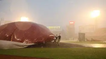 練習を行っていた日本ハムナインは慌ててベンチ裏へ。新庄監督も苦笑いを浮かべながら引き揚げた。球場スタッフはグラウンドにシートを敷こうとしたが、強風にあおられてなかなか制御できない場面もあった。