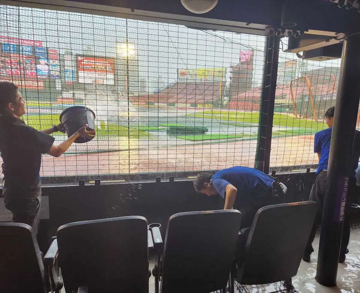 ネット裏の席「プレステージ・プレミア」は床に10センチほど水がたまってしまう事態に。排水ポンプに加え、スタッフが総出でバケツで水をかき出すなど、試合開始に向けて懸命な作業が続けられたが状況が回復せずに中止が決まった。